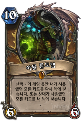 | 부연 설명 | 버려진 건 못 가져옵니다. 하뮬을 저번에 한 번 내고 어찌 어찌 양조사로 돌렸으면 하뮬을 가져옵니다. 한번 가져오면 다음에 가져올 땐 저번에 가져와서 아직 쓰지 못한 건 빼고 가져옵니다. 덱 최대치(30)를 넘을 수 없습니다. |
