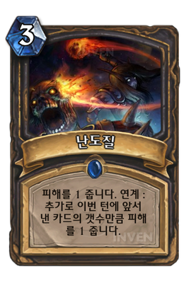 | 부연 설명 | 예를들어 맘가 칼부 맹독 절개 맘가를 쓴 뒤 이카드를 쓰면 1-1(맘)-1(칼)-1(맹)-1(절)-1(맘)으로 총 6데미지를 주는거죠. 주문 공격력 하수인이 있으면 타수별로 주문 공격력 받구요. 탈노스-맘가-난도질이면 2뎀을 3번 받는거죠. 사실 아예 이쪽을 노리고 만든겁니다. 말리-기습-기습-맘가-절개-동전-맹독-맘가-난도...이 얼마나 끔찍하고 무시무시한 생각이니? 사실 난도질보다는 그림자 분신쪽이 더 비슷하긴 한데, 이건 또 다르게 만들게 있어서... |