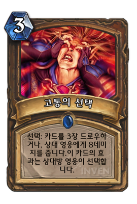 | 효과 | 선택: 카드를 3장 드로우하거나, 상대 영웅에게 8데미지를 줍니다.이 카드의 효과는 상대방 영웅이 선택합니다. | ||