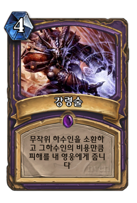 | 효과 | 무작위 하수인을 소환하고 그하수인의 비용만큼 피해를 내 영웅에게 줍니다 | ||
