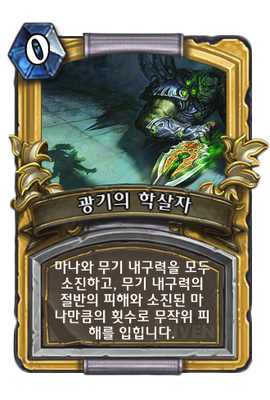 | 부연 설명 | 무기 내구력이 암살자의 검 껴서 5상태일때, 혹은 똥칼 영능늘려서 그정도 이상일때, 무기내구력 /2의 피해를 필드의 모든 캐릭터에게 소진된 마나를 공격횟수로 전환 하여 피해를 입힘. * 암살자의 검 기대 값 : 2.5* (소진된마나) / (캐릭터 포함 하수인 수) 필드에 7마리올라와 있으면 25/8 (광역 3뎀정도) |