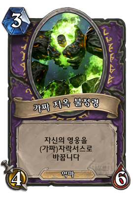 | 부연 설명 | 자락서스:자신의 생명력보다 10아래로 생명력 조정 1아래로 내려간다면 1로 조정 무기:자신이 악마를 낼때마다 피해를 4얻습니다 이 카드는 자신이 카드를 뽑을때마다 내구도가 1씩 잃습니다 (0/5) 영능:피해를 3입는대신 카드를 한장 뽑습니다 피드백 받아요 |