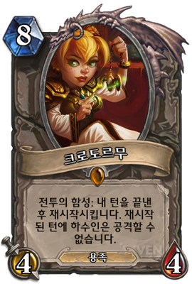| 효과 | 전투의 함성: 내 턴을 끝낸 후 재시작시킵니다. 재시작된 턴에 하수인은 공격할 수 없습니다. | ||