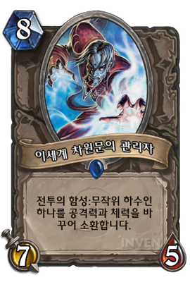 | 효과 | 전투의 함성:무작위 하수인 하나를 공격력과 체력을 바꾸어 소환합니다. | ||