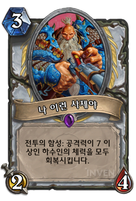 | 효과 | 전투의 함성: 공격력이 7 이상인 하수인의 체력을 모두 회복시킵니다. | ||