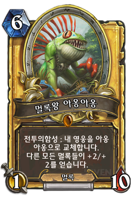 | 효과 | 전투의함성 : 내 영웅을 아옹아옹으로 교체합니다. 다른 모든 멀록들이 +2/+2를 얻습니다. |