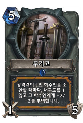 | 효과 | 공격력이 1인 하수인을 소환할 때마다, 내구도를 1잃고 그 하수인에게 +2/+2를 부여합니다. | ||
