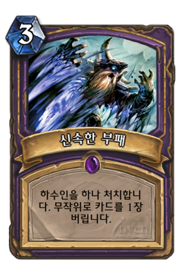 | 효과 | 하수인을 하나 처치합니다. 무작위로 카드를 1장 버립니다. | ||