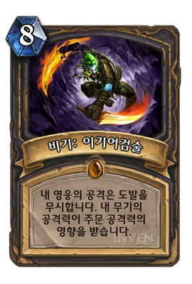 | 효과 | 내 영웅의 공격은 도발을 무시합니다. 내 무기의 공격력이 주문 공격력의 영향을 받습니다. | ||