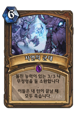 | 효과 | 돌진 능력이 있는 3/3 나무정령을 둘 소환합니다. 이들은 내 턴이 끝날 때 모두 죽습니다. |