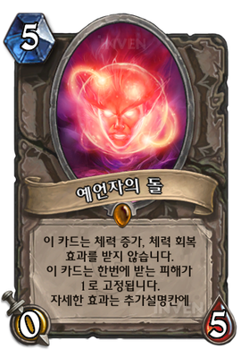 | 부연 설명 | 자리가 모자라서 이곳에 씁니다. 이 카드는 체력 증가, 체력 회복 효과를 받지 않습니다. 이 카드는 한번에 받는 피해가 1로 고정됩니다. 상대가 하수인 카드를 내면 다음 상대턴까지 그 하수인을 내필드에 복사합니다. 밸런스 지적받아요. |