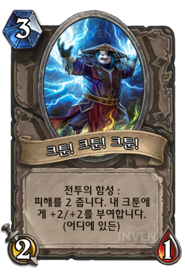 | 효과 | 전투의 함성 : 피해를 2 줍니다. 내 크툰에게 +2/+2를 부여합니다. (어디에 있든) |