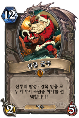 | 부연 설명 | 죽여주세요! 내 전장과 덱의 모든 하수인이 돌진과 도발을 얻습니다. 살려주세요! 내 영웅의 생명력을 모두 회복시키고 카드를 세장 뽑습니다. 팬티 주세요!!! 적 영웅의 팬티를 빼앗아옵니다. 50% 확률로 가로쉬의 팬티를 가져옵니다. 요호호! |