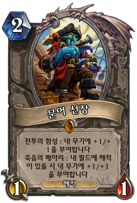 | 효과 | 전투의 함성 : 내 무기에 +1/+1을 부여합니다 죽음의 메아리 : 내 필드에 해적이 있을 시 내 무기에 +1/+1을 부여합니다 |