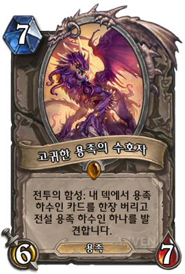 | 효과 | 전투의 함성: 내 덱에서 용족 하수인 카드를 한장 버리고 전설 용족 하수인 하나를 발견합니다. | ||