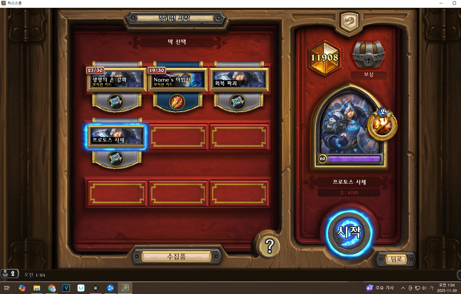 일단 오랜만에 하니 카드도 가진게 없고 가장 무난하게 만들 수 있는 프로토스 사제로 전설을 달았습니다.