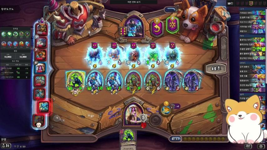 전형적인 방밀전사덱입니다.냥꾼을 상대하기 위해 헤멧네싱워리를 채용했습니다.가즈로는 6코스트에 바로 내기보다는 7~8코스트에 다른 주문과 함께 내도록 노력하는게 좋습니다.이 버티는 타이밍을 난투 두개와 각종 제압기, 무기로 버티는 식으로 운영하면 될 것 같습니다.초반 멀리건으로는 전쟁도끼, 난투, 방어구 제작자, 죽빨, 고통, 벌목기를 주로 잡고,사냥꾼이나 법사라면 케잔도 잡을수 있다면 잡습니다.배후자를 이용해 쌍 가즈로 기계공장을 만들거나쌍 라