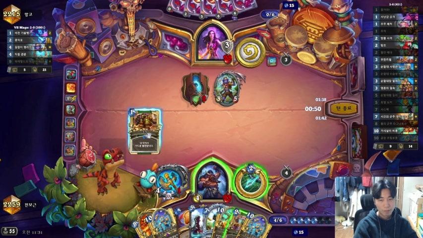 잘풀려서 6턴에 파마가 혼자 나오면 화염구-영능으로 잡는게 베스트입니다. 여기까지 성공하면 거의 이깁니다. 기계덱은 하수인이 많아서 참회나 엎드려 빼기가 참 좋아요. 화염구가 없어서 엎드려-앙갚음으로 도전자한테 버프가 걸리면 이쪽에서도 위협이 될 만한 벌목기나 버프받은 땜장이가 나가서 명치를 함부로 못때리게 하는게 세컨드입니다. 박사붐이라도 던져야 합니다. 저 덱을 돌리면서 제가 느낀 점은, 완벽한 불기둥 청소각이 보이지 않는 이상 내 필드를 비우는 건 자살행위라는 겁니다. 명치를 보호할 수단이 거의 없기 때문에 성기사가 명치 치게 냅두면 힘에서 밀립니다.